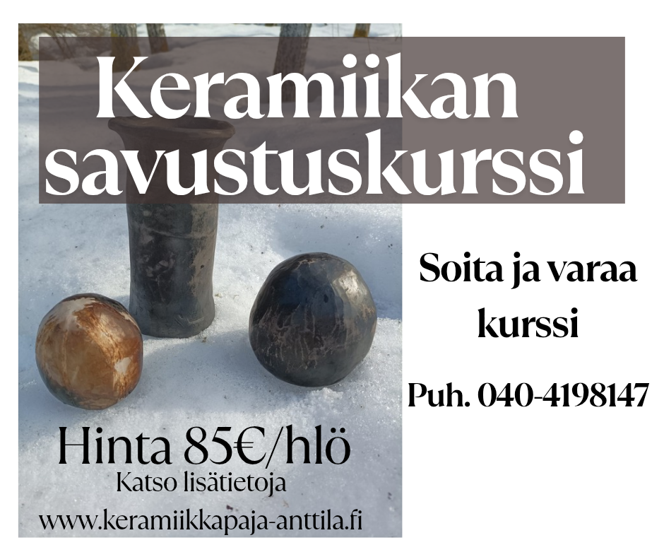 Kurssi sisältää savet, työvälineet, opetuksen, poltot ja kahvin.