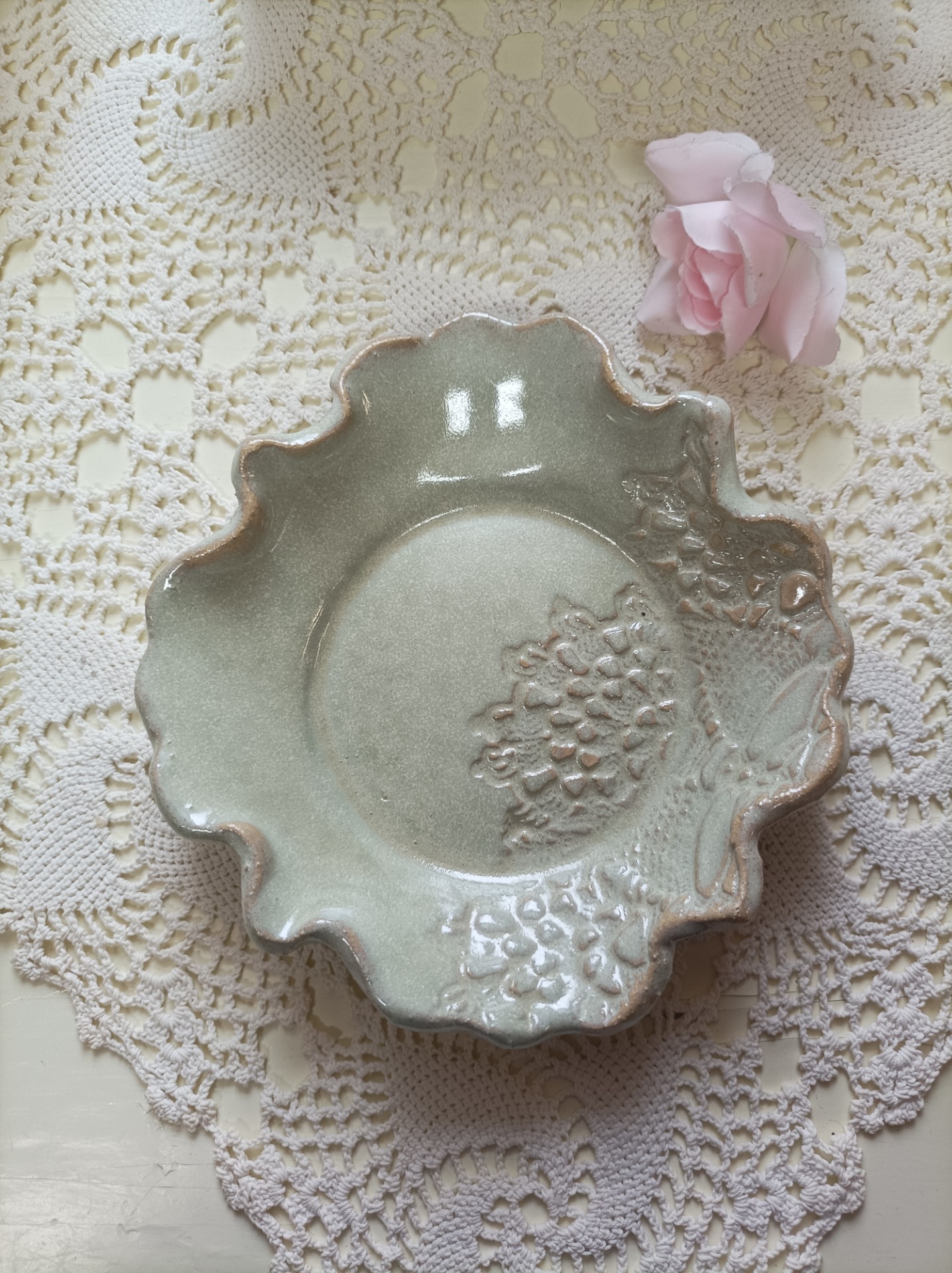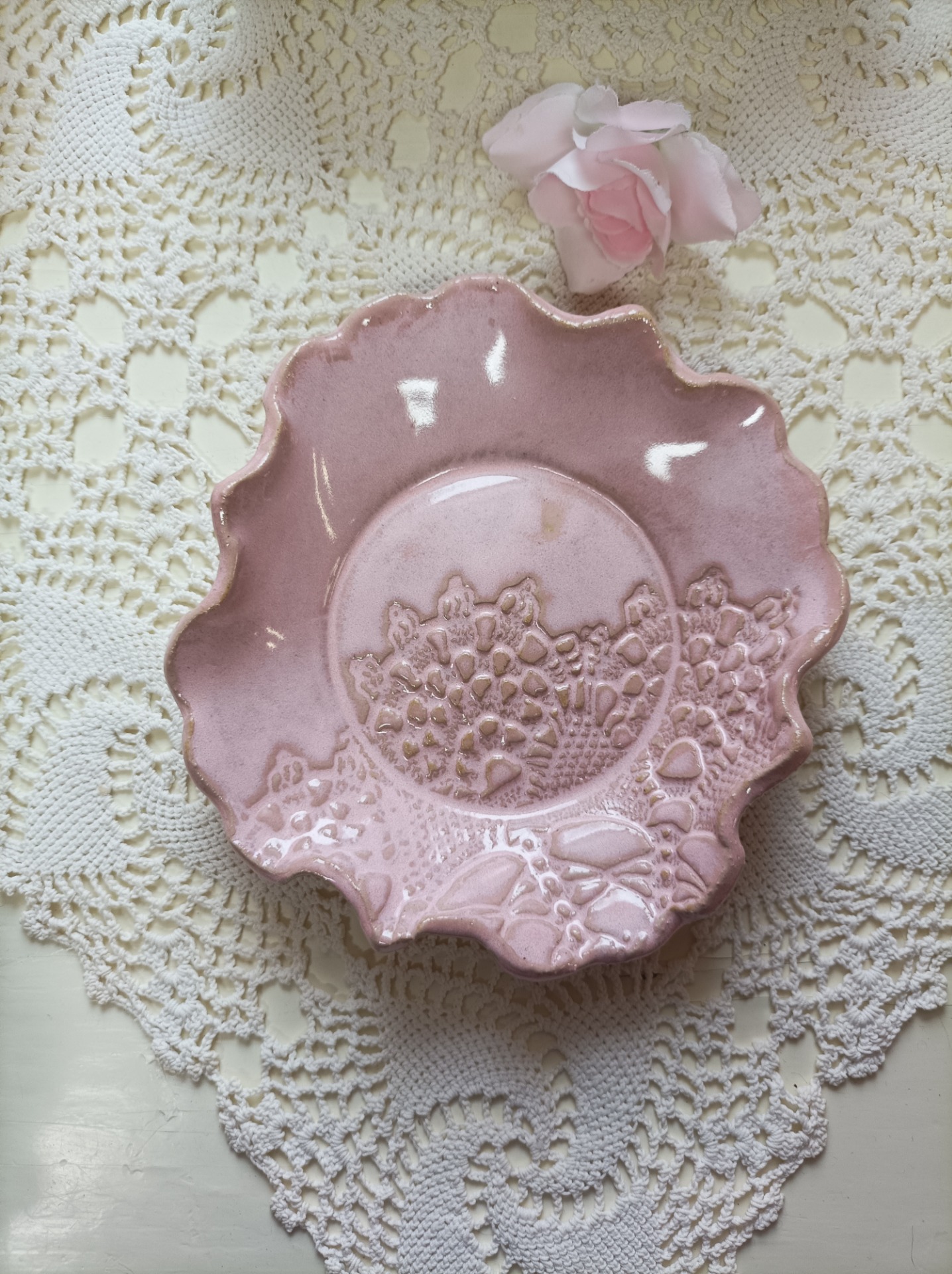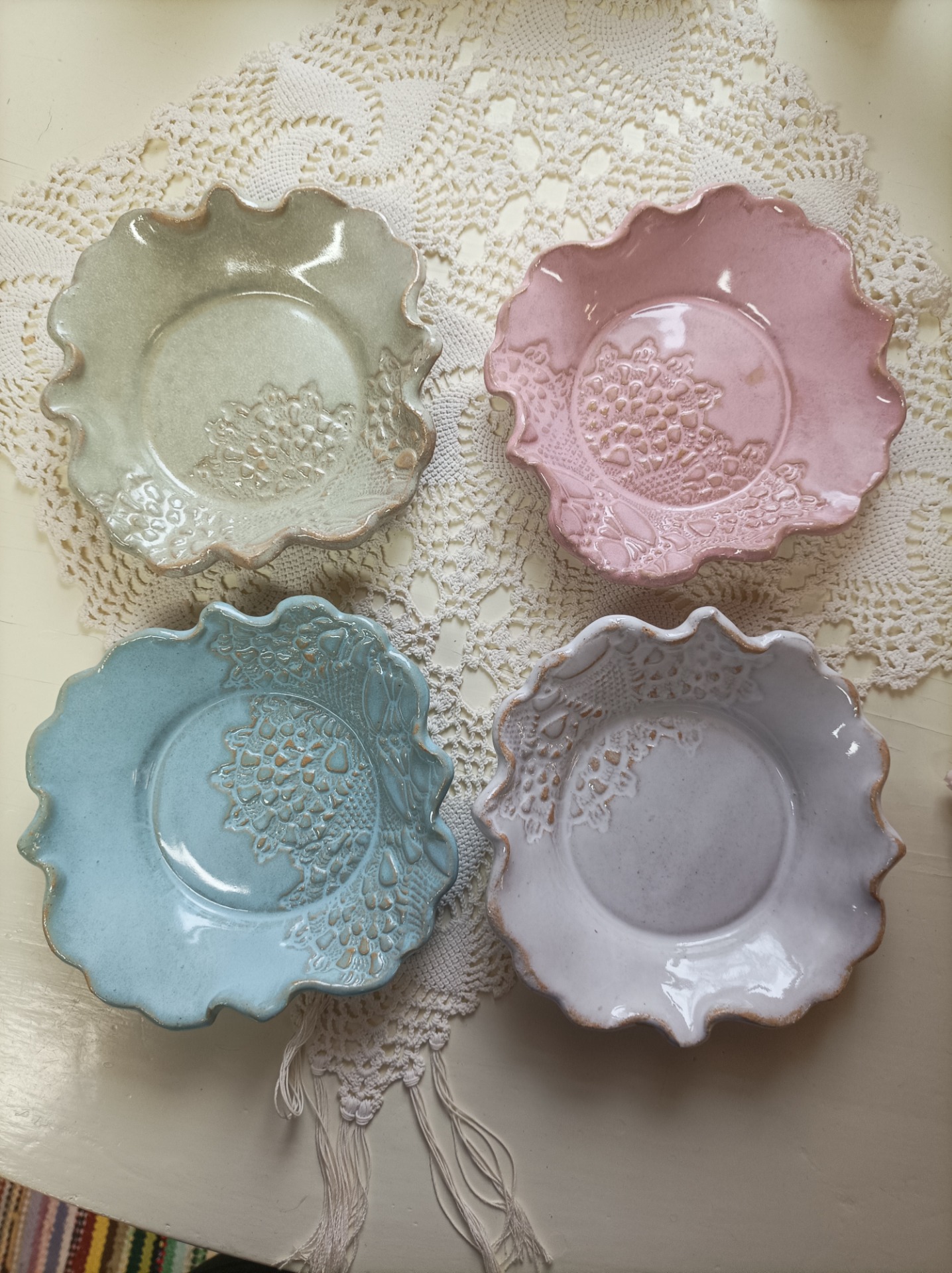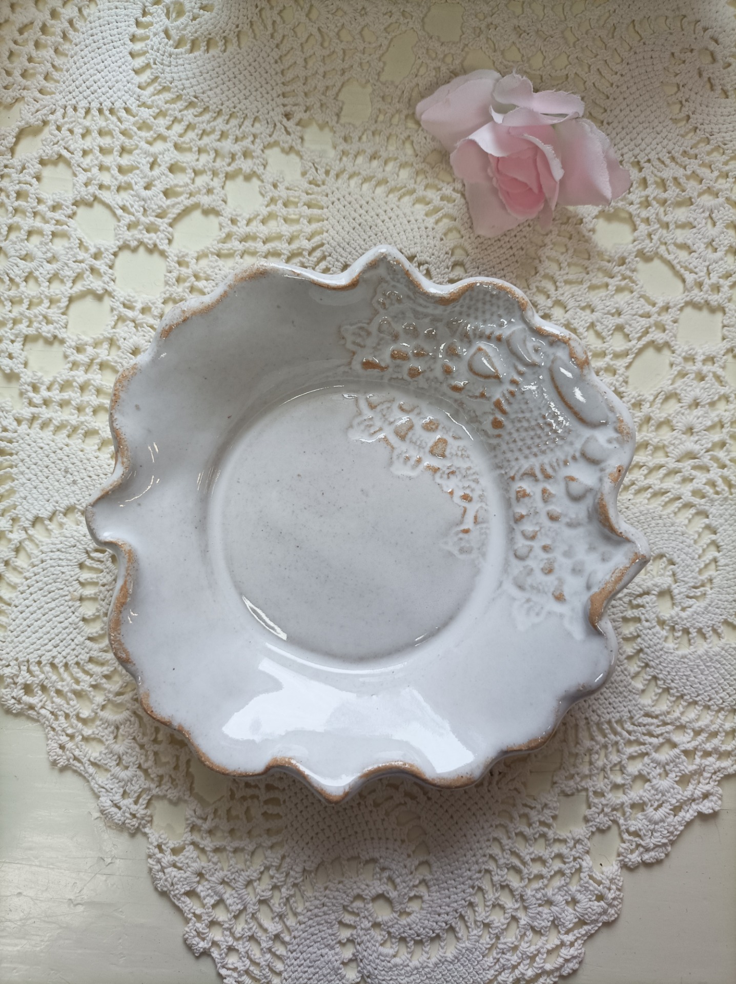 Lautanen kauniilla pitsi kuviolla saatavana useissa väreissä  koko n.16 cm.. korkeus n.2.5 cm  soveltuu tiski kone pesuun. mikro sekä uunin käytön